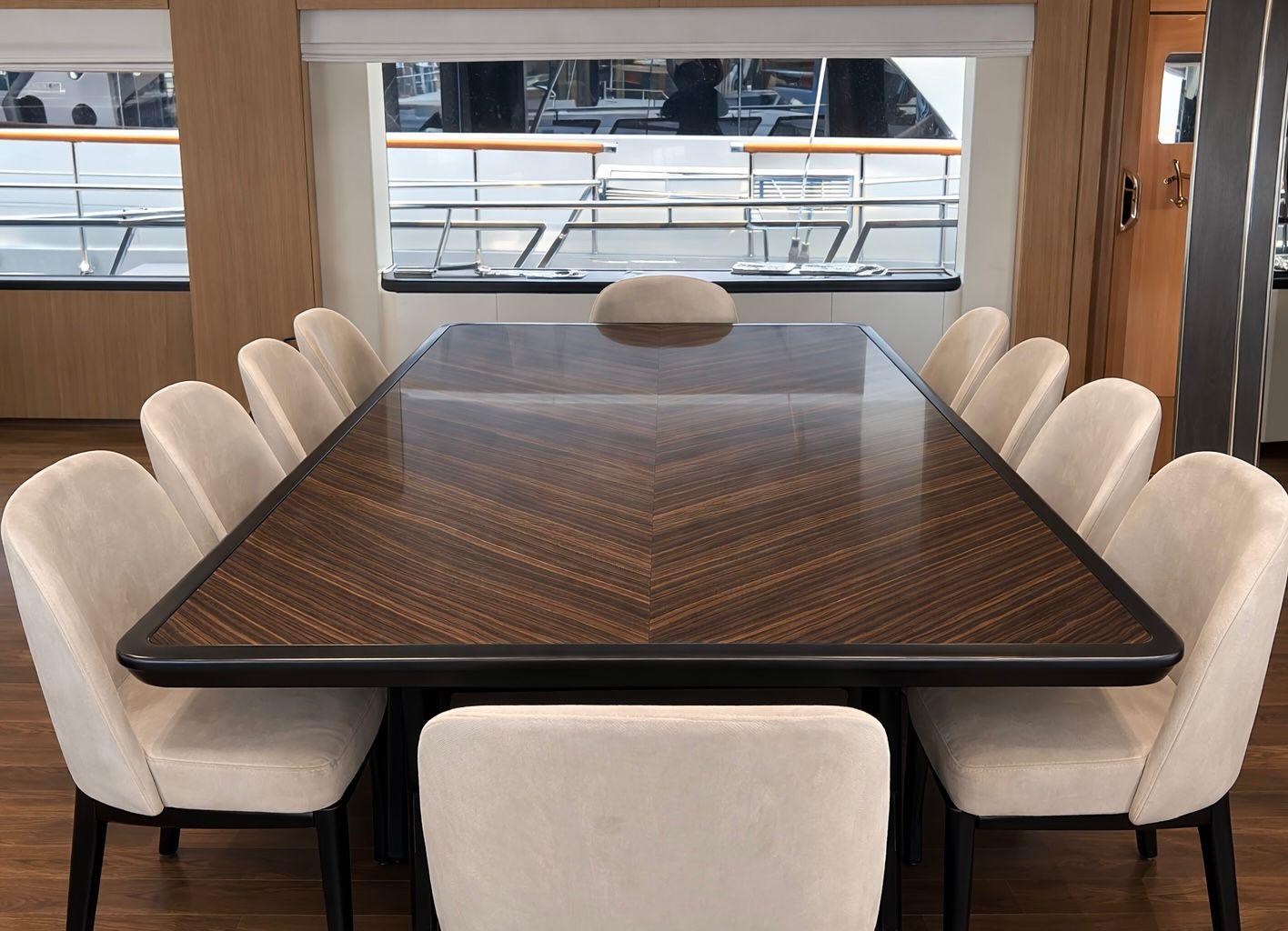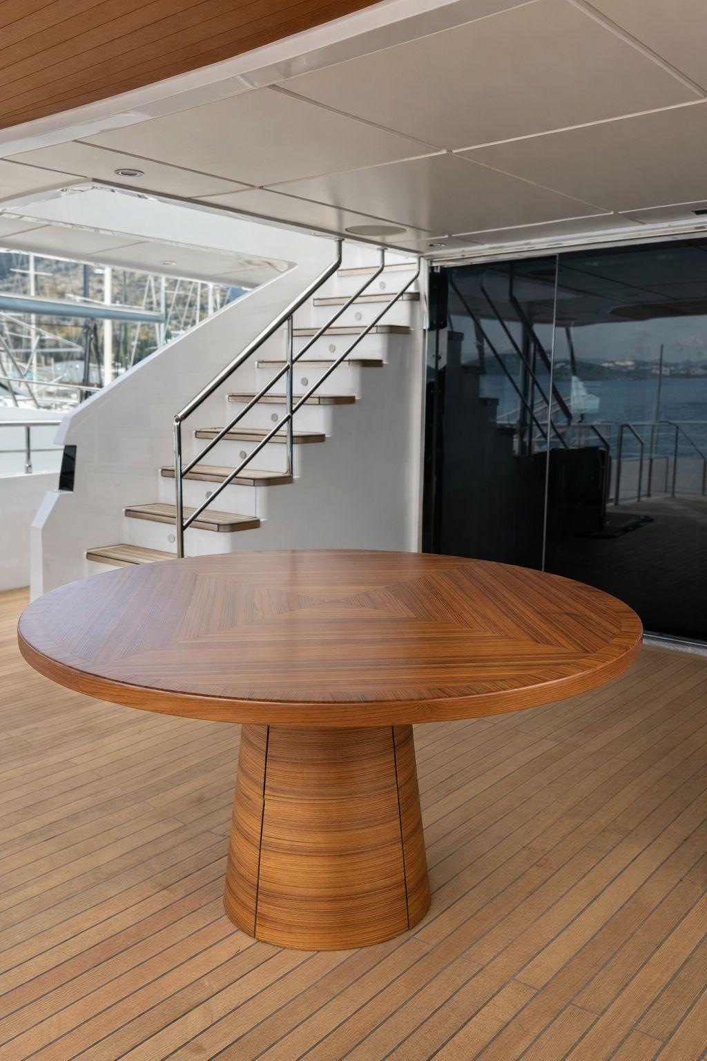 A similar design approach was applied to the upper deck, where a round six-person dining table was developed, again with a focus on material consistency and craftsmanship. Across all elements, the project reflects a balance between functionality, adaptability and refined detailing, supported by a strong production-driven approach.