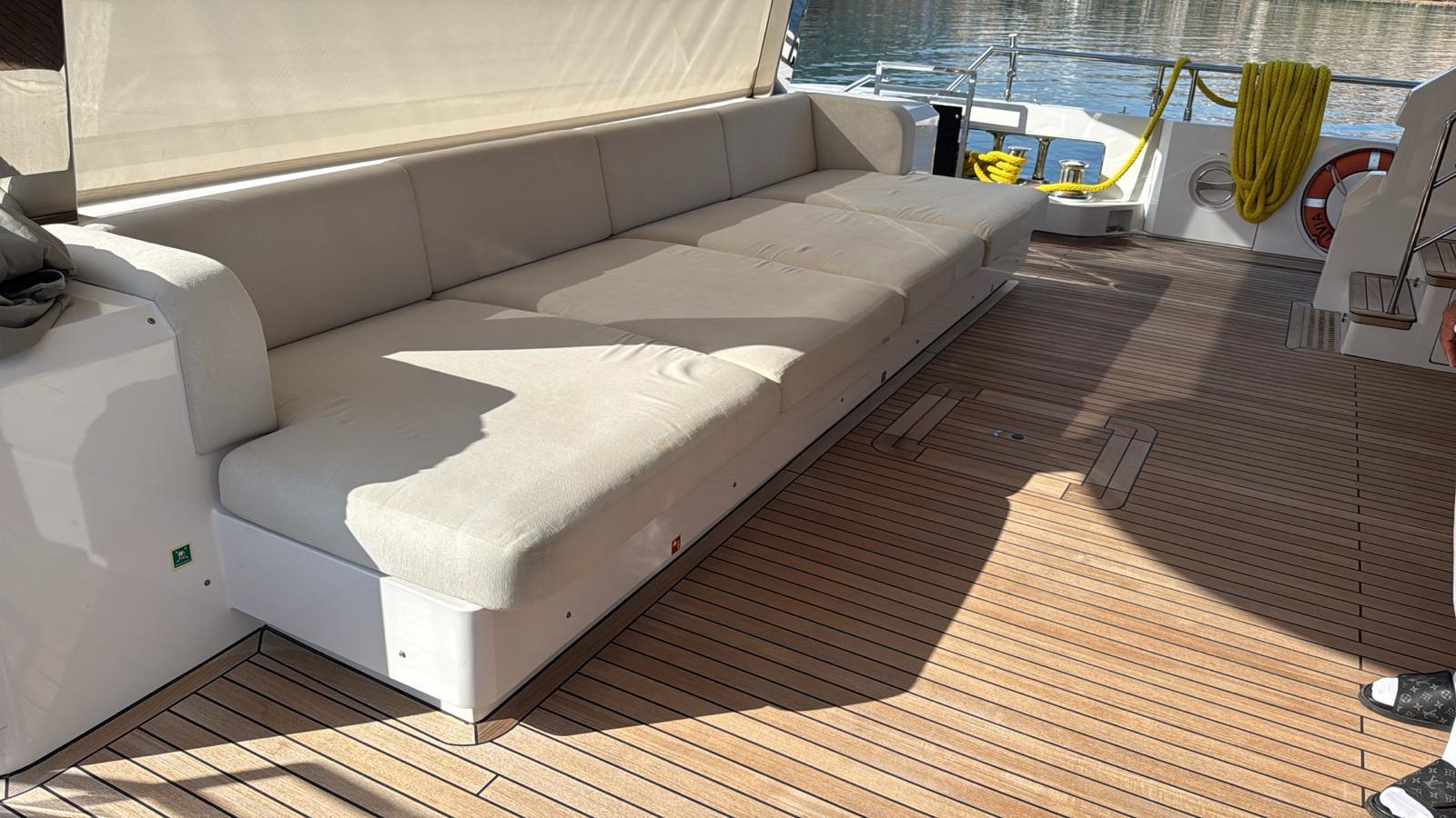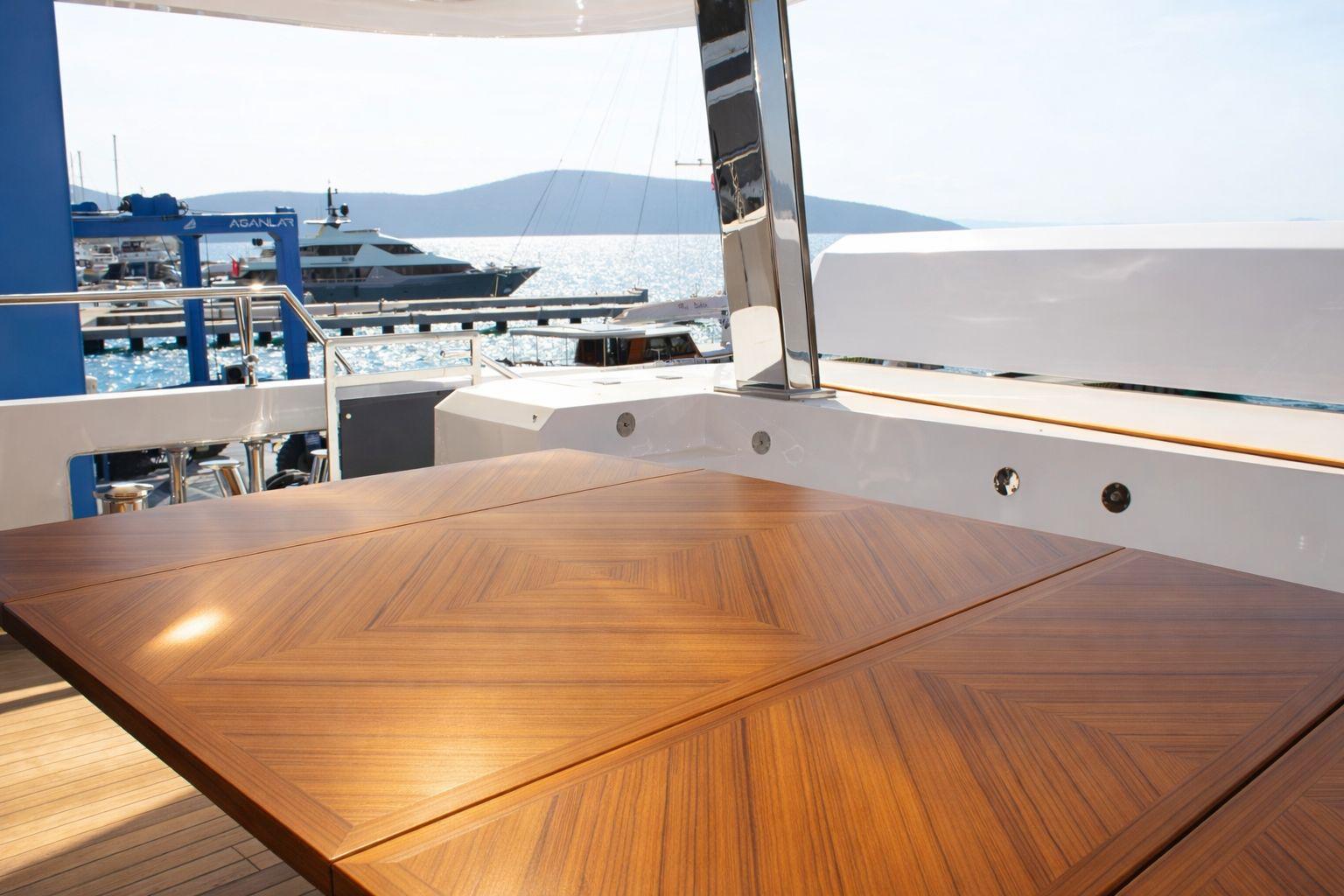 As part of this refit project, Due Mani Interiors was responsible for the interior design of the main salon and sky lounge, as well as the design and the production of selected exterior interventions. One of the key elements developed for the aft deck was a custom-designed teak table system, conceived to function both as a large dining table and as two separate bistro tables when closed. The design allows flexibility of use, accommodating up to eight to ten guests when fully extended, while maintaining a more casual and compact setting in its closed configuration. Particular attention was given to teak veneer pattern continuity, ensuring a seamless visual flow in both open and closed states.